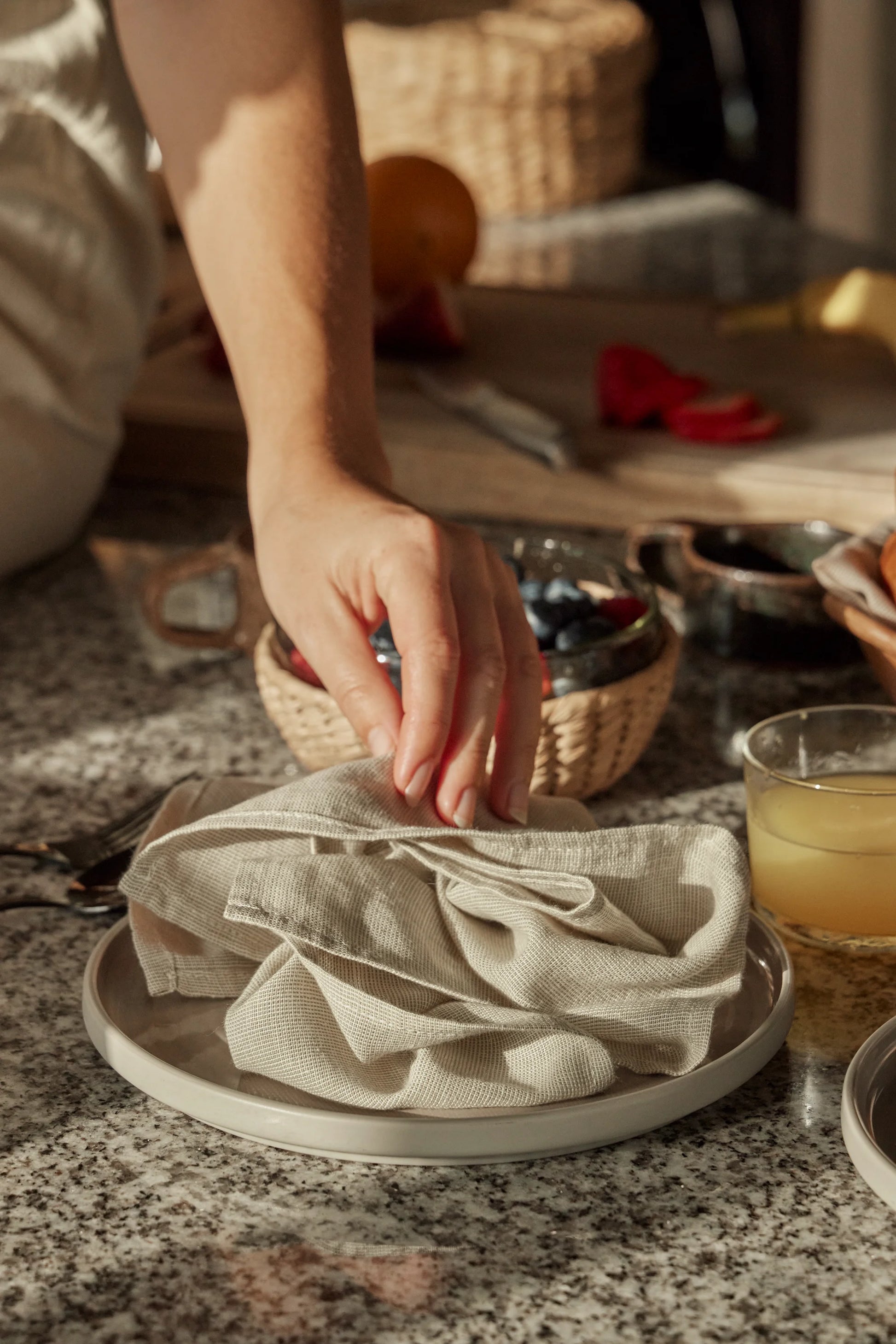 Woven from 100% organic cotton in our lightest gauze chambray, these napkins pair airy softness with everyday practicality. The open weave offers a gentle drape and tactile elegance while staying naturally absorbent, making even a simple meal feel intentional and beautifully made. Their subtle tones and featherlight texture invite you to slow down and savor, proof that the most essential things can also be the most refined.
